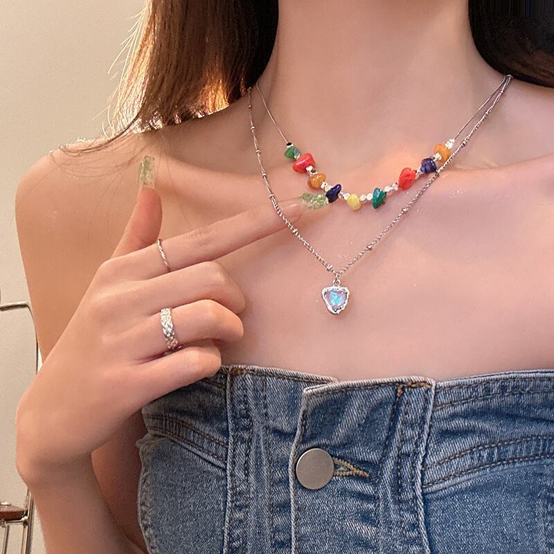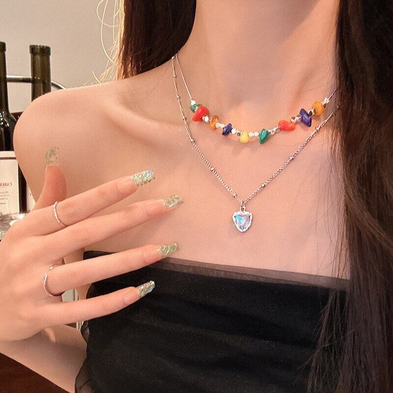 送料無料 KAITIN カラーストーン樹脂ハート二重層女性ネックレスライト高級首輪チェーン多用途ネックレススタイル レッド レース AE88788764715673613