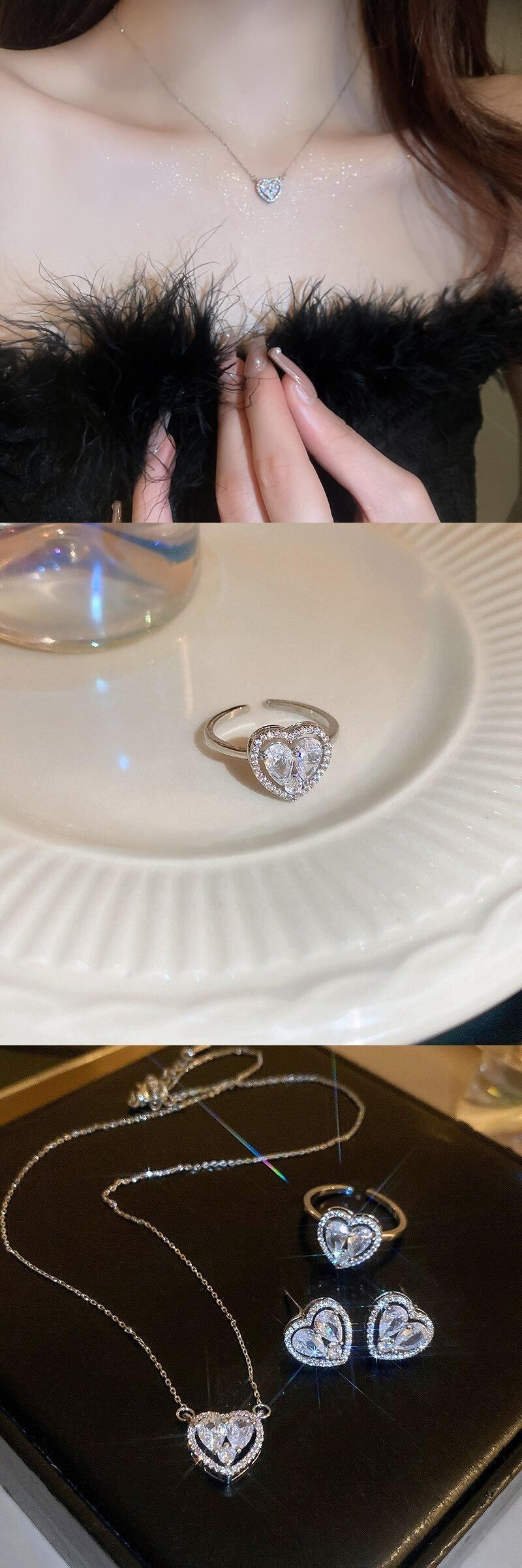 送料無料 KAITIN ジルコンハート女性のネックレスイヤリングセットシンプルなスタイルリング美的ジュエリーセット女性友人ギフト レース 指輪 AE88788762879763558