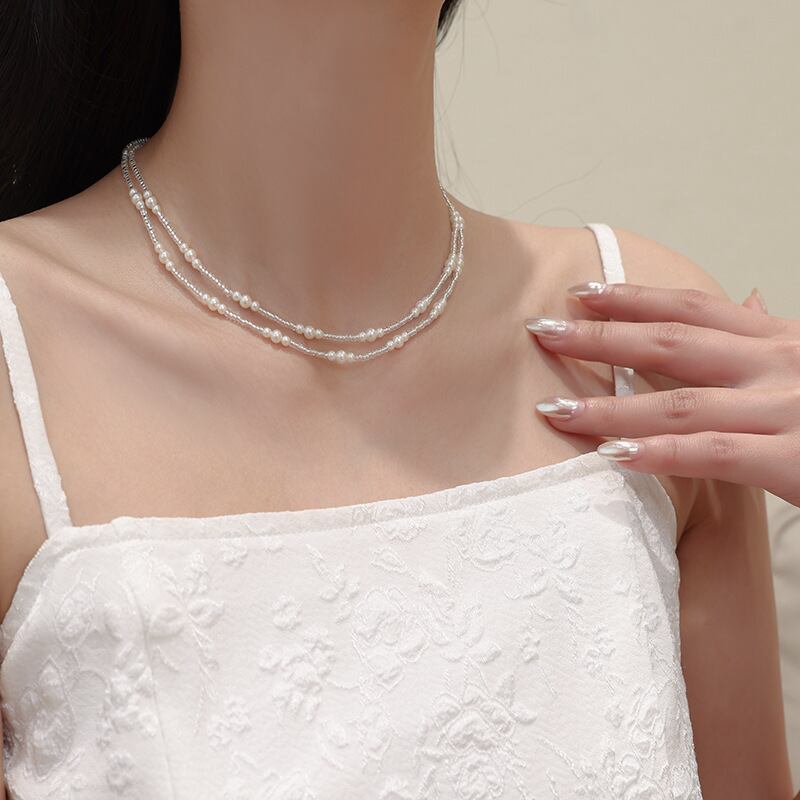 送料無料 二重層ビーズパールネックレス女性パーソナライズ首輪チェーンネックチェーン 2023 アクセサリーウェディングギフト レース 真珠 AE88788733895574979
