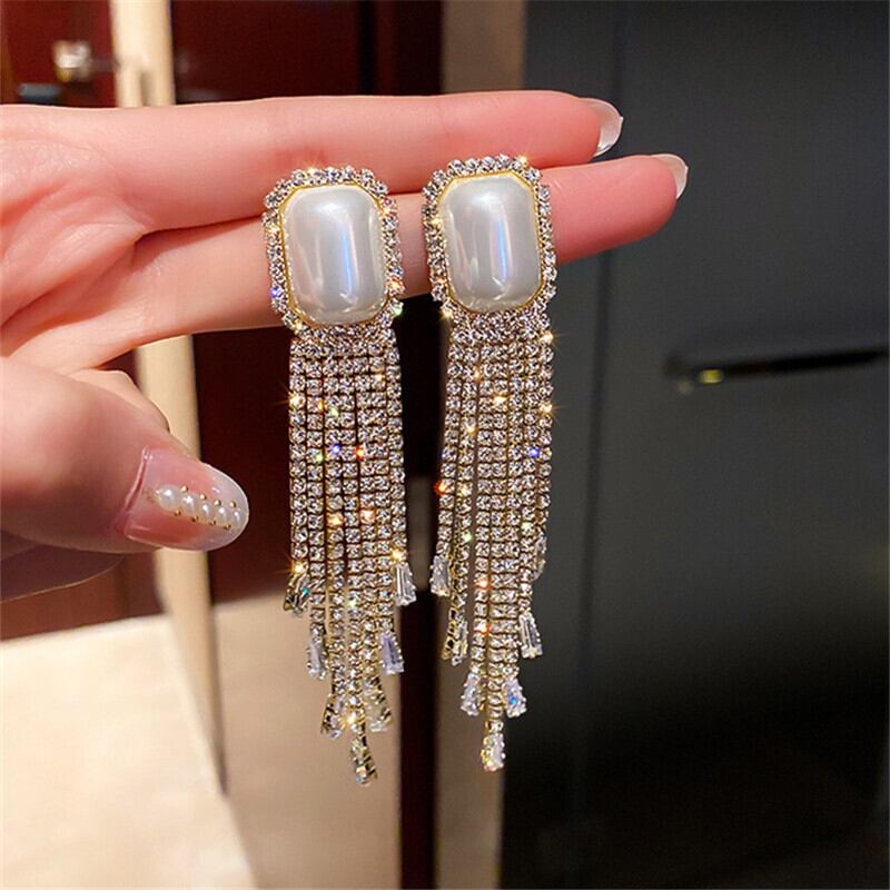 送料無料 KAITIN 幾何長方形テルクリスタルパールイヤリング女性の高級モザイクラインストーンイヤリングパーティーウェディングジュエリー 真珠 指輪 AE88788713747693905