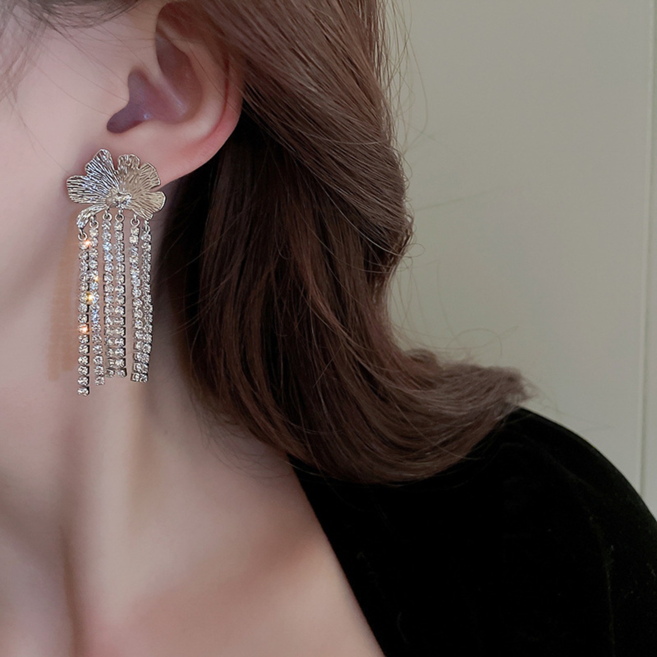 送料無料 KAITIN シルバー ニードル ダイヤモンドの花びら付き ロング チェーン イヤリング ライト ラグジュアリー パーソナライズされた Tel ダングル イヤリング 指輪 銀 AE8878873870208592