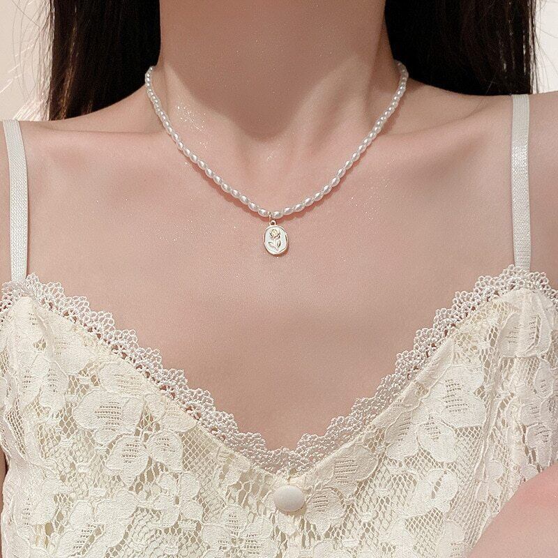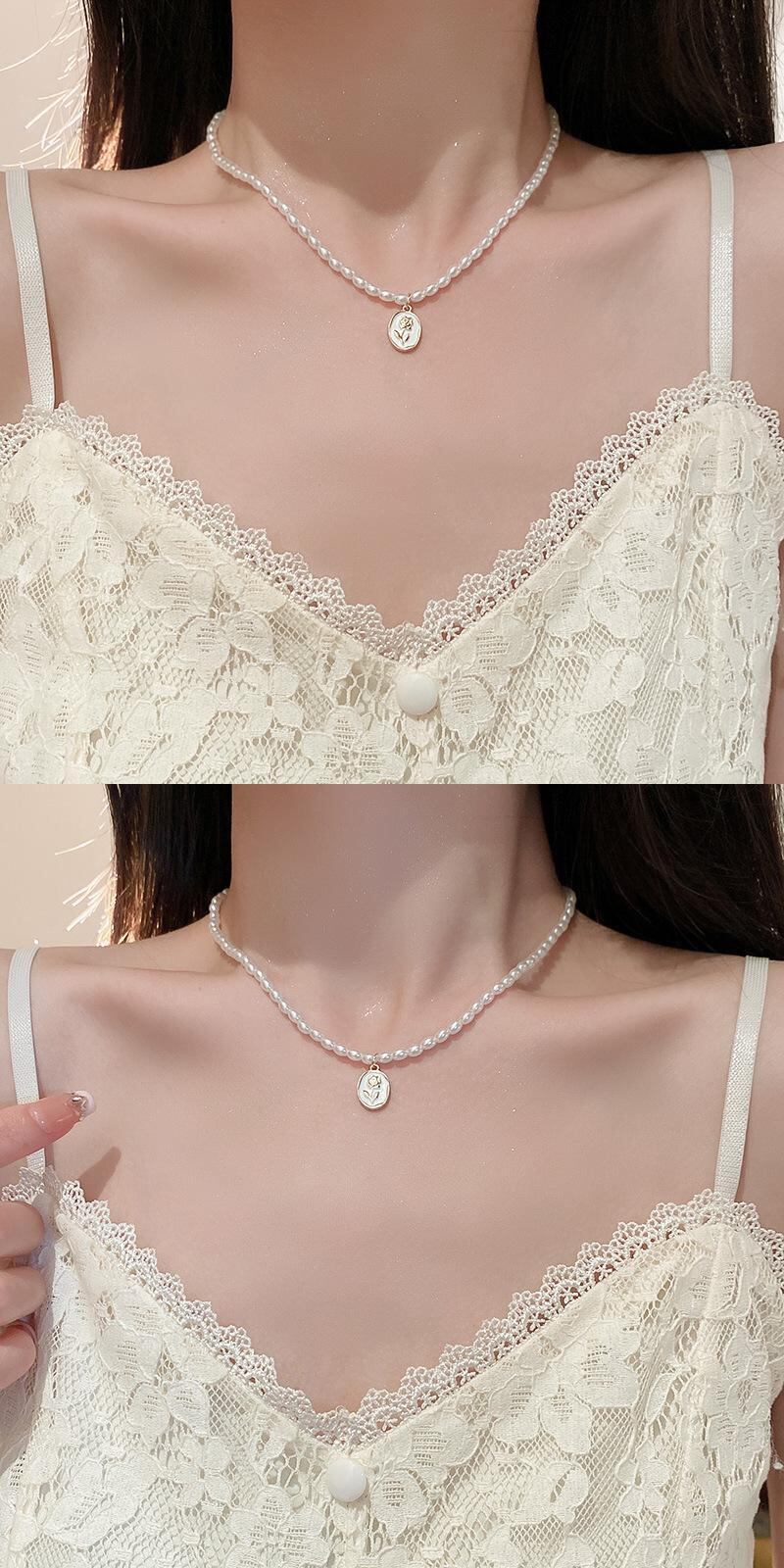 送料無料 KAITIN パールオーバルチューリップフラワーネックレス女性の首輪チェーン多用途ネックレス装飾ガールパーティージュエリー レース 真珠 フラワーデザイン AE88788759419959309