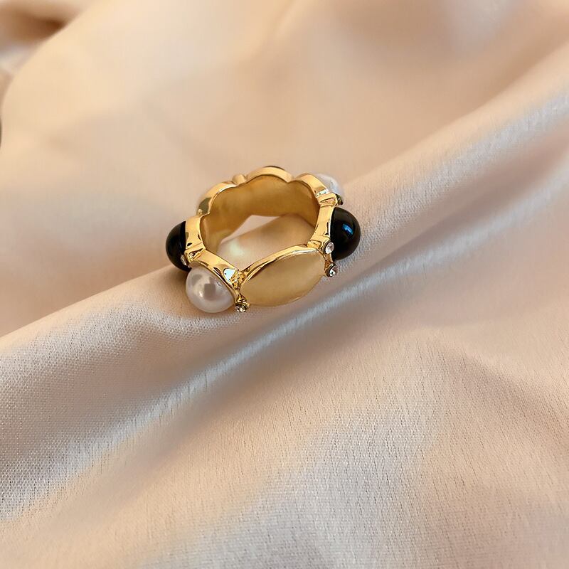 送料無料 Ins スタイルダイヤモンド象嵌ブラックホワイトパール女性リングミニマリスト気質エンドパーソナライズジュエリー女性 指輪 真珠 AE88788783857950653