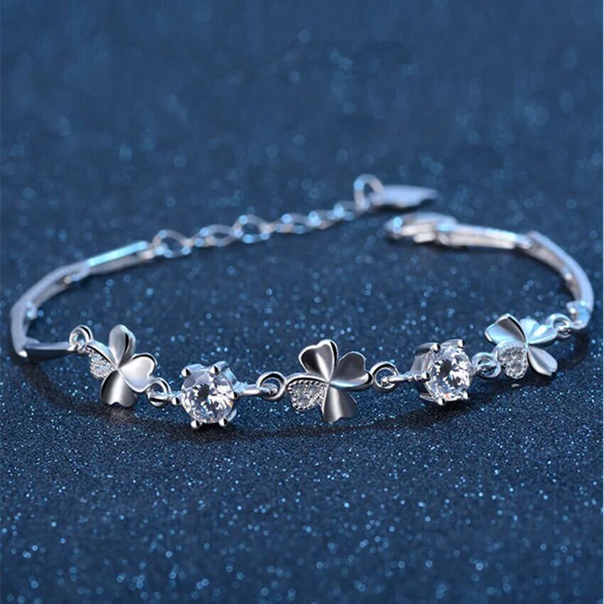 送料無料 925 スターリングシルバージルコンラッキークローバー形ブレスレットクリスタルチェーン女性バレンタインギフトウェディングパーティーかわいいジュエリー 20 センチメートル 大人ガーリー スウィート キュート カジュアル 銀 AE121233556624704123972
