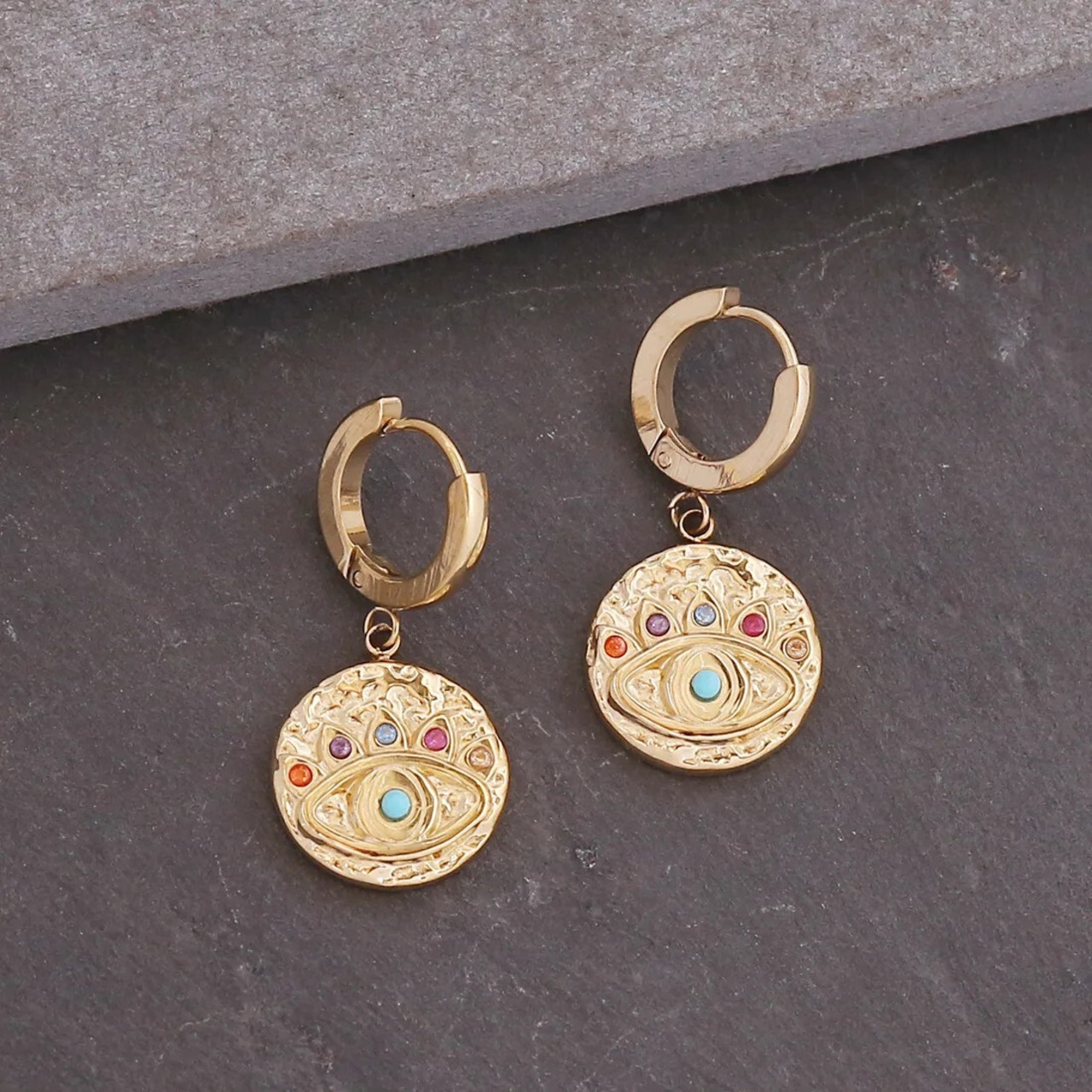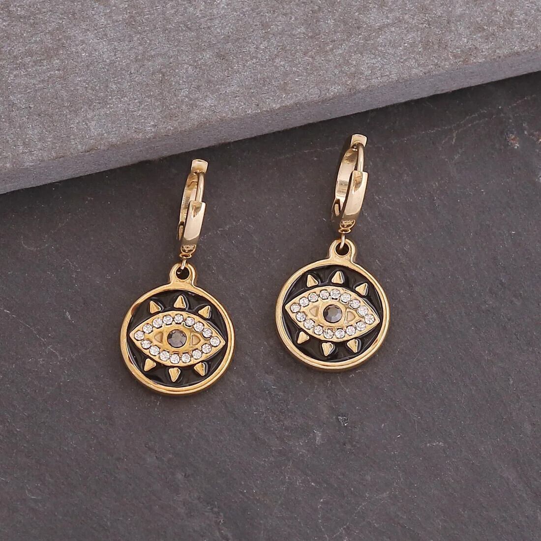 送料無料 1PC ゴシックラインストーンステンレス鋼邪眼イヤリングパンクゴールドカラーフープイヤリング女性オレッチニドナパーティーギフト 2021 指輪 AE121233223325599119868
