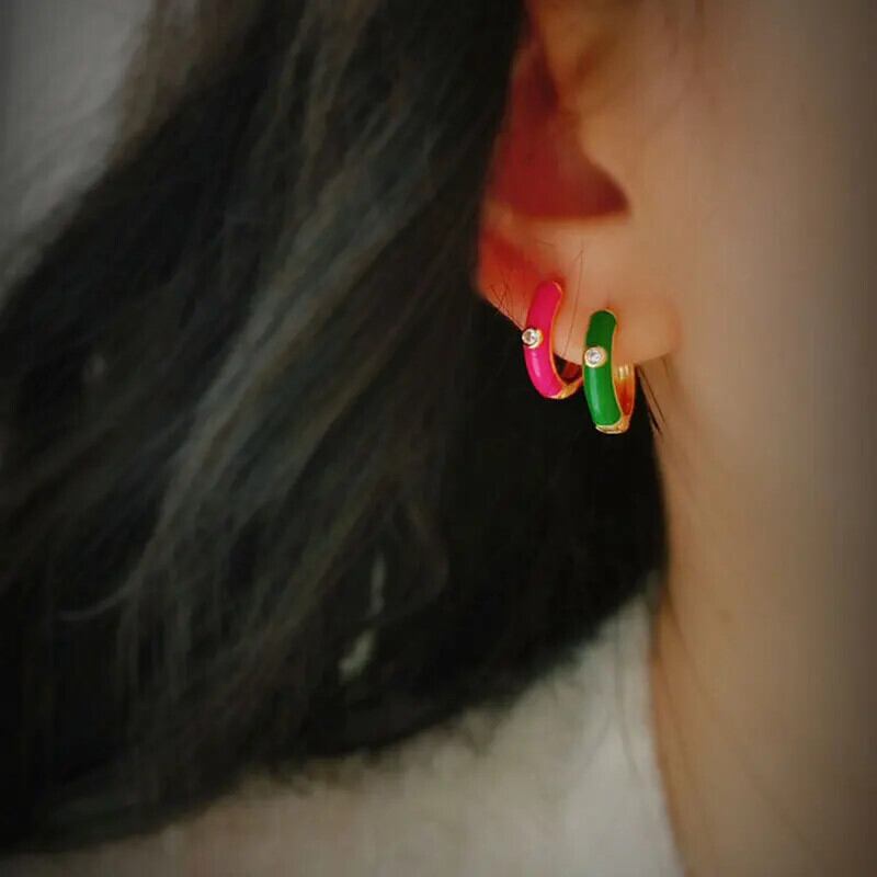送料無料 2 個ステンレス鋼のカラフルなラウンドフープイヤリング女性 2022 トレンディな滴るオイルジュエリーインジルコンクリスタルハギーイヤリング 指輪 AE1212332233280584824894