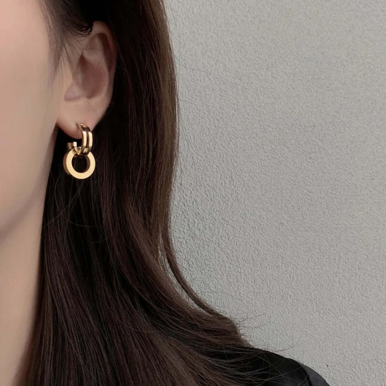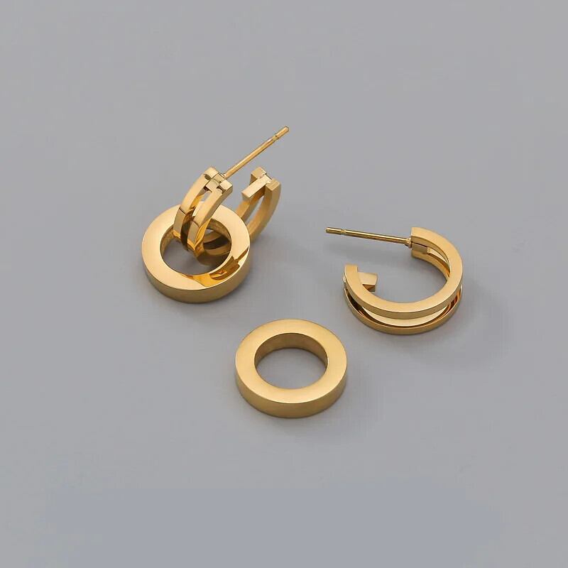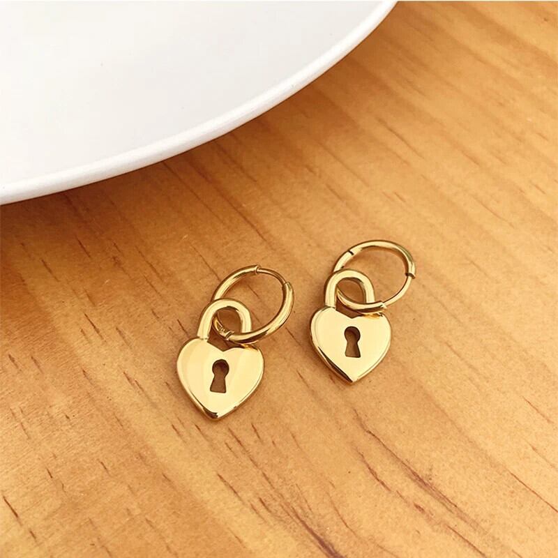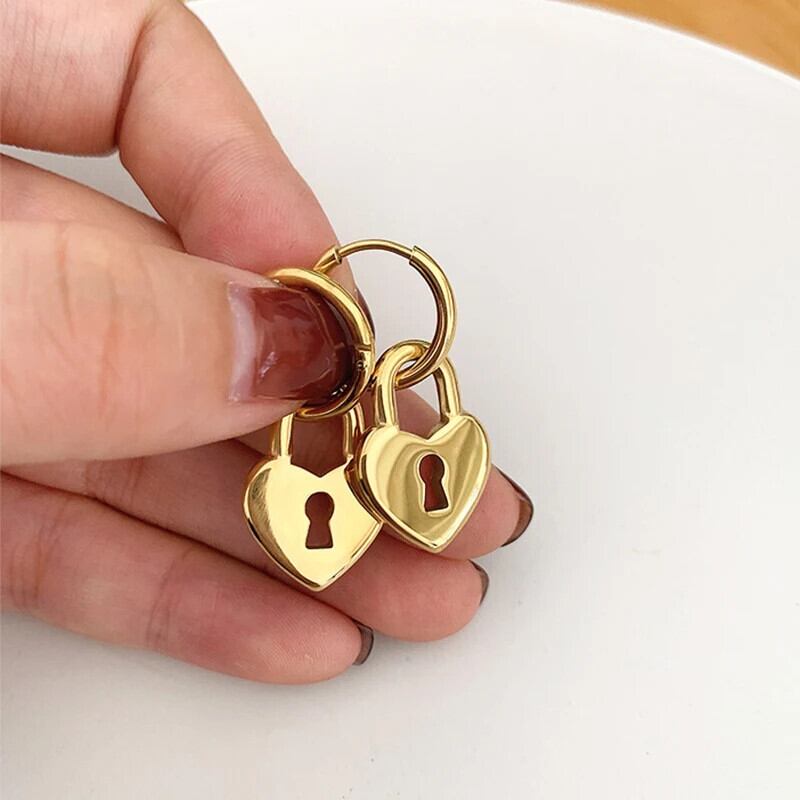 送料無料 ステンレス鋼ゴールドカラーのハートロックフープイヤリング女性幾何学的なシンプルな二重円ウェディングジュエリーギフト 指輪 AE1212332233227966671665
