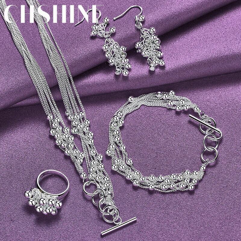 送料無料 CHSHINE 925 スターリングシルバーブドウビーズネックレスリングイヤリングブレスレット女性男性パーティー絶妙なジュエリーセット レース 指輪 銀 AE0077766693106709182