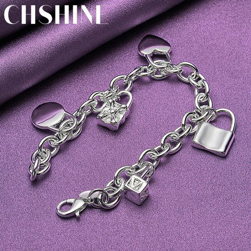 送料無料 CHSHINE 925 スターリングシルバースクエアハートラウンドロックペンダントブレスレット女性チャームジュエリーギフト 銀 スクウェア AE0077766667150300170