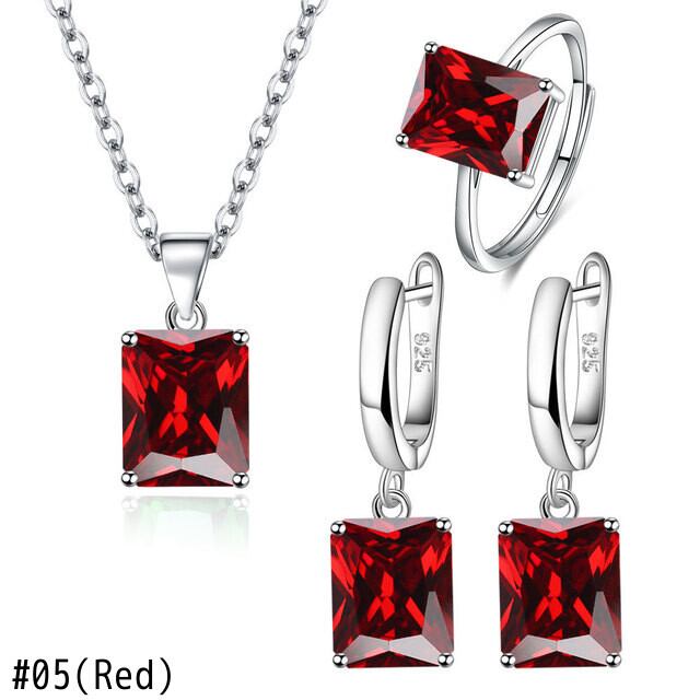 送料無料 925 スターリングシルバーリングイヤリングネックレス女性長方形幾何学ジルコンウェディングジュエリーセットアイテム レース 指輪 銀 AE0077766676381443266