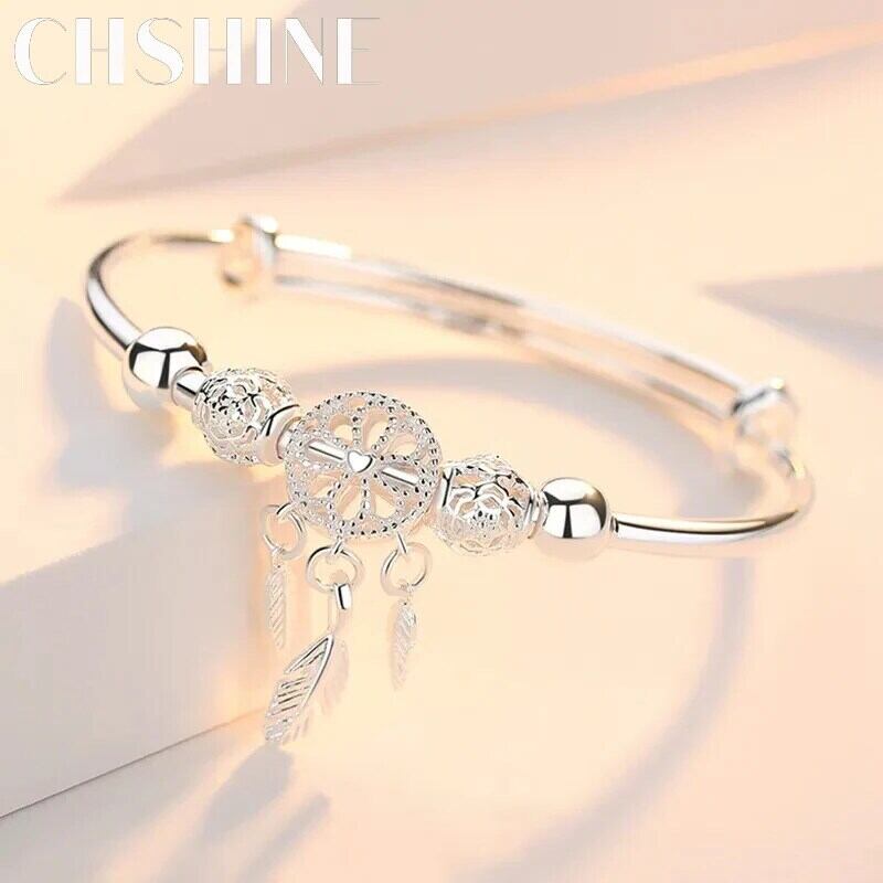 送料無料 調節可能な 925 スターリングシルバーバングルドリームキャッチャーテルフェザーラウンドビーズチャームブレスレットカフ女性の結婚式 アジャスタブル 銀 AE0077766619444981765
