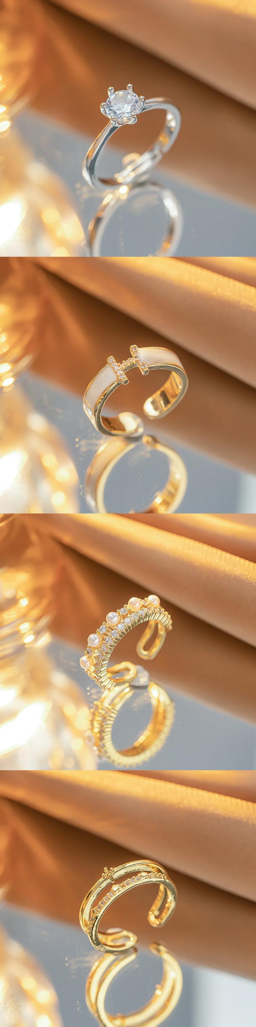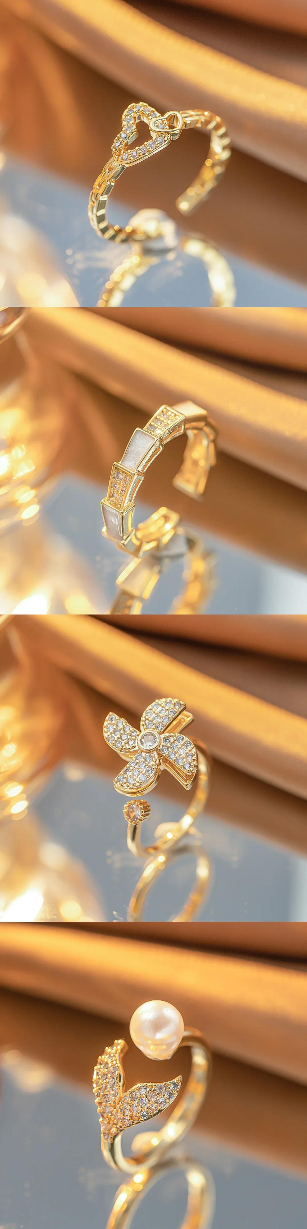 送料無料 ゴールドカラーステンレス鋼オープニングリング女性パールクリスタルジルコンシェル象嵌さまざまな形状の結婚指輪ジュエリー 真珠 AE1218878788775551517153