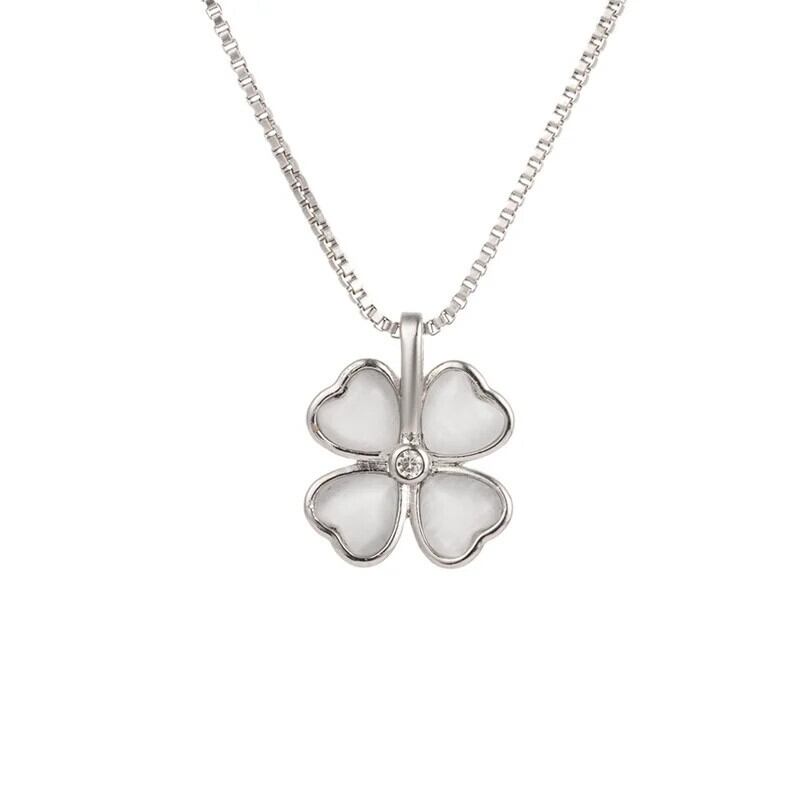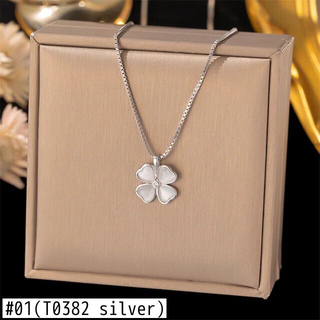 送料無料 繊細な四つのクローバーネックレス女性ステンレス鋼オパールフラワーペンダントシルバーカラーネックレスウェディングジュエリーギフト レース 蛋白石 フラワーデザイン 銀 AE1218878788725864395767