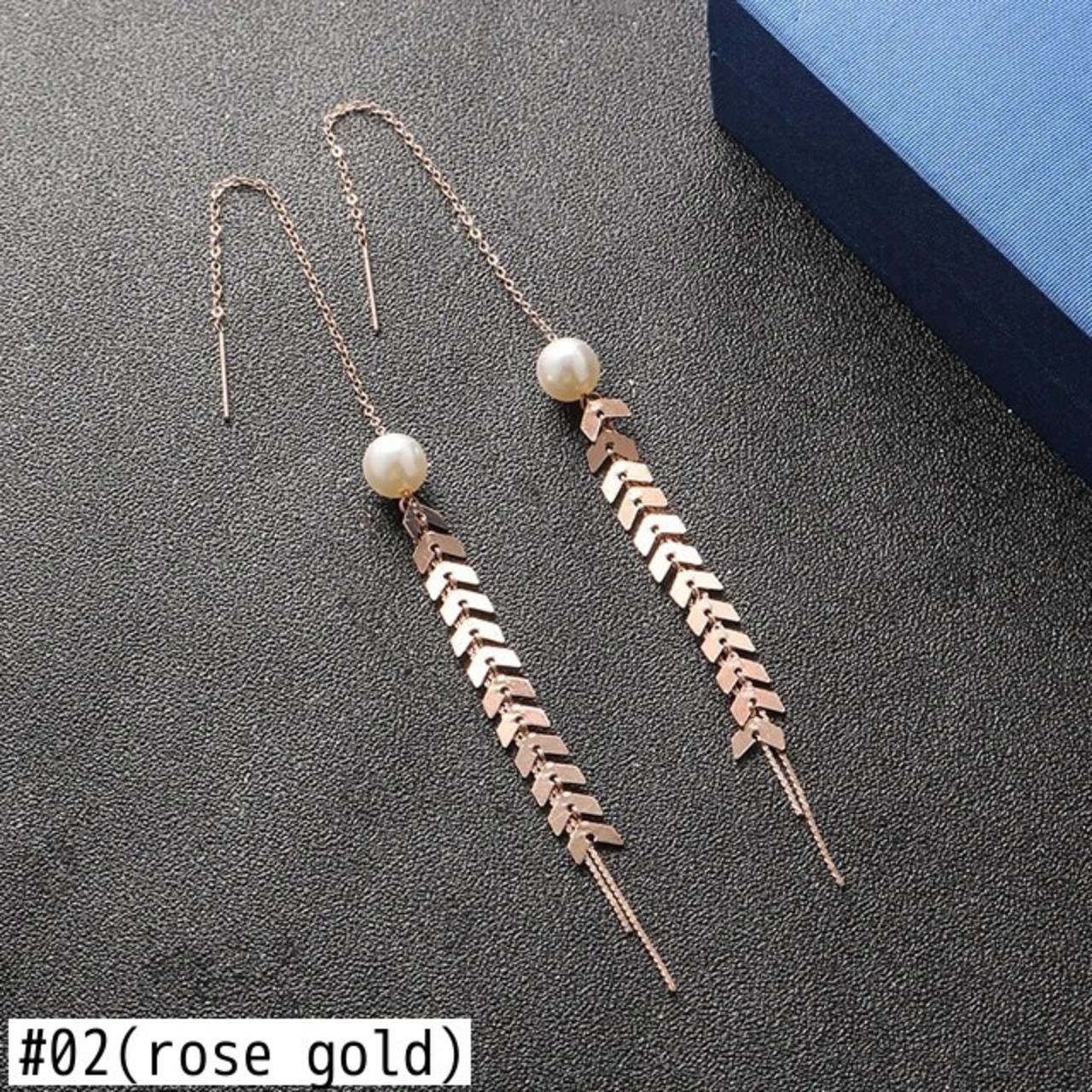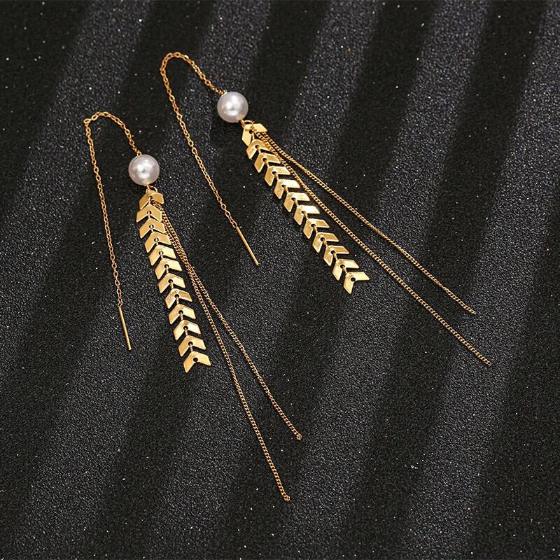 送料無料 2023 ステンレス鋼のイヤリングチェーンパール小麦耳ラインローズゴールドカラーロングブラブライヤリング女性ジュエリー 真珠 指輪 AE1218878788776635506621