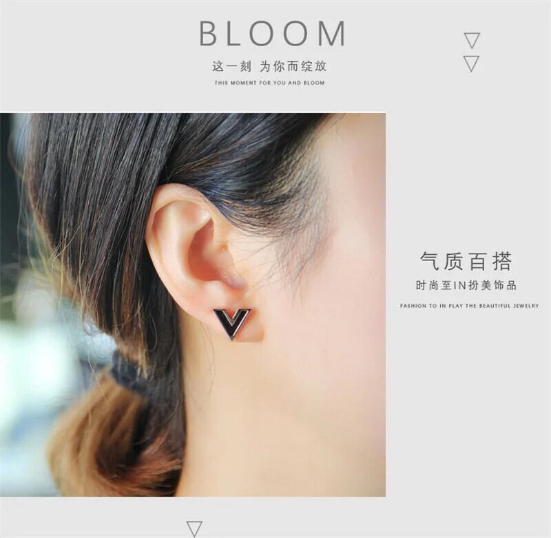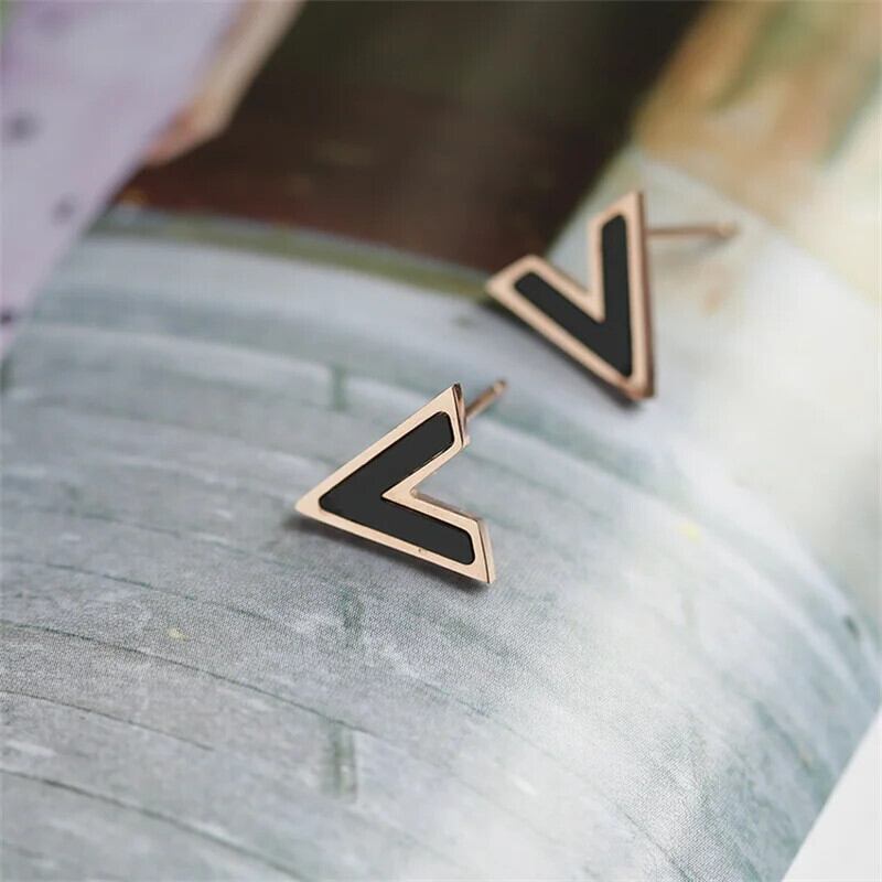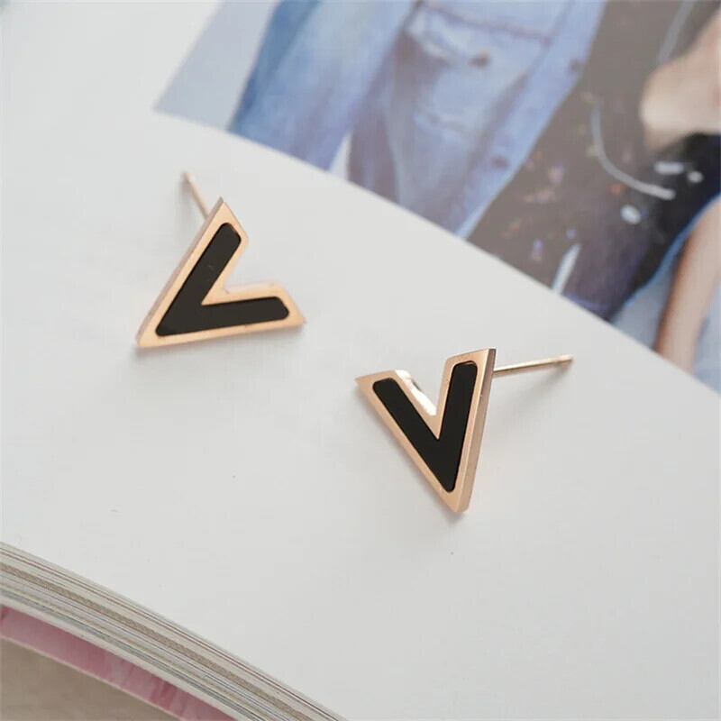 送料無料 2023 高級ジュエリーシンプルな V レターイヤリング女性ステンレス鋼ブラックカラーパーティースタッドピアス 指輪 AE1218878788779166550842