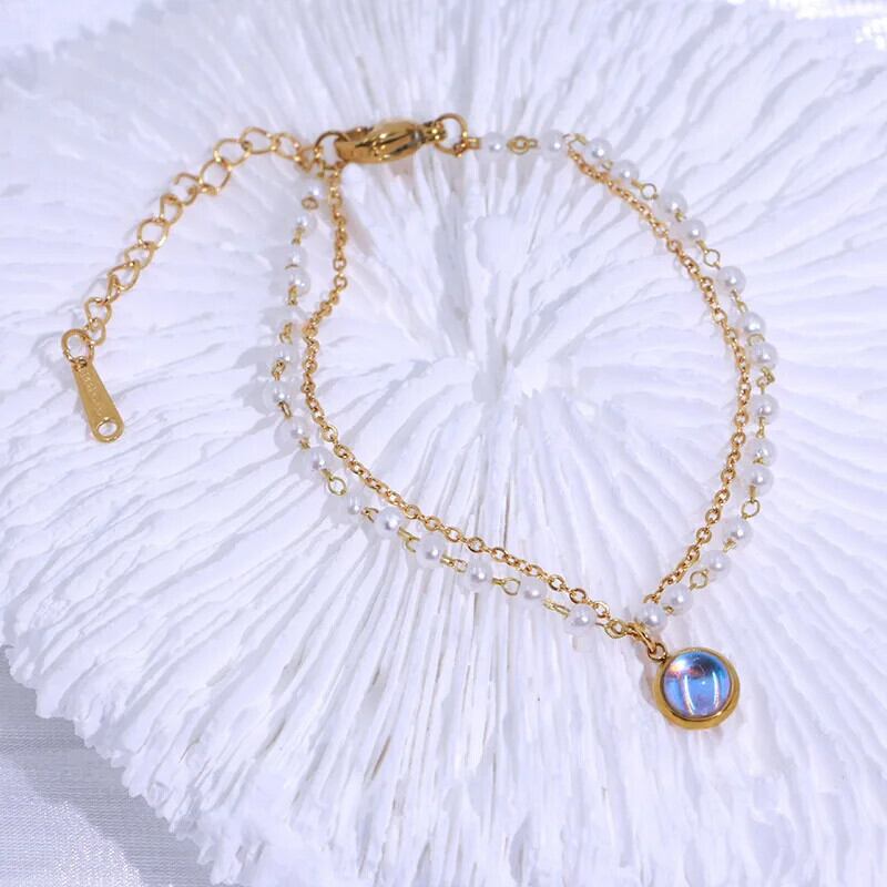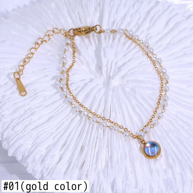 送料無料 316L ステンレス鋼ブルージルコンクリスタルパールブレスレット女性ガールトレンドブレスレットダブルチェーン非退色ジュエリーギフト 真珠 AE1218878788750091009045