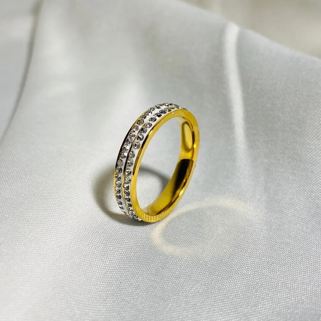 送料無料 ホットヴィンテージレトロスタイルスチールリング女性 2 行クリアクリスタルジュエリーステンレス鋼婚約結婚指輪 ビンテージ AE1218878788774207808006