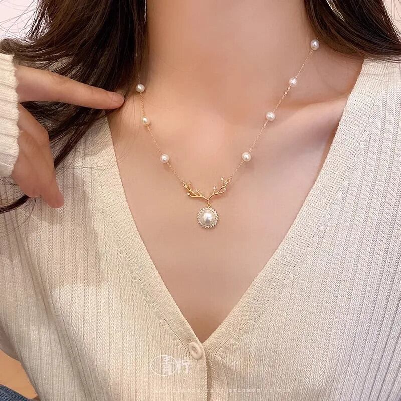送料無料 高級チタン鋼ヘラジカのネックレスチャームパールジルコン鹿の角ペンダントカップルジュエリーパーティー女性のアクセサリーギフト レース 真珠 AE1218878788715595698326