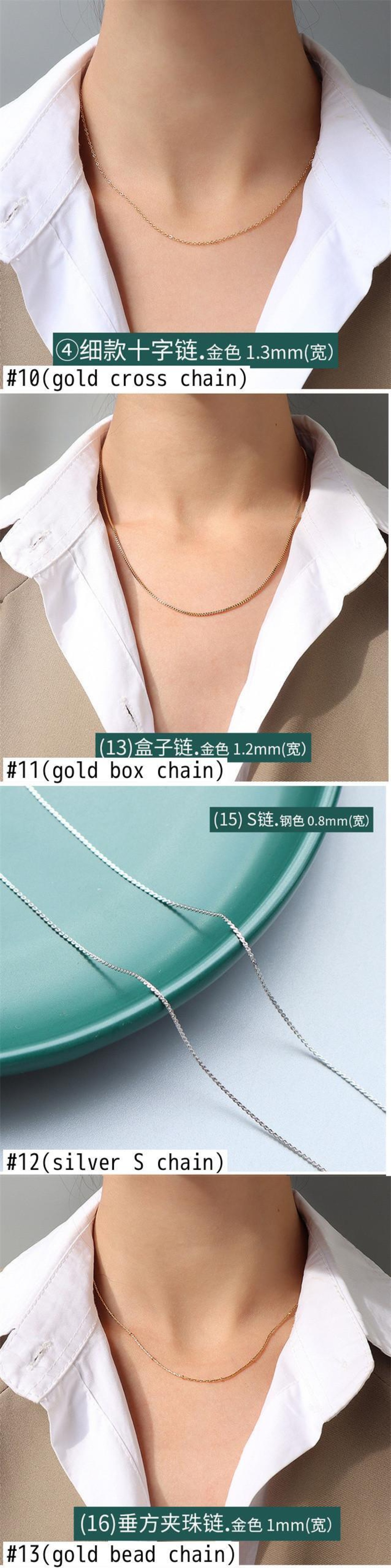 色:01(細ツイストチェーン),02(シルバークロスチェーン),03(クロスビーズチェーン),04(ゴールドフィガロチェーン),05(太ツイストチェーン),06(シルバーフィガロチェーン),07(ゴールドスネークチェーン),08(シルバースネークチェーン),09(シルバースクエアスネーク),10(ゴールドクロスチェーン),11(ゴールドボックスチェーン),12(シルバーSチェーン),13(ゴールドビーズチェーン),14(シルバービーズチェーン),15(ゴールドリップチェーン),16(シルバーリップチェーン),17(ゴールドスクエアスネーク),18(ゴールドスクエアチェーン),19(ゴールドSチェーン),20(シルバーボックスチェーン),21(金水波),22(シルバーウォーターウェーブ),23(シルバースクエアチェーン),24(緑)