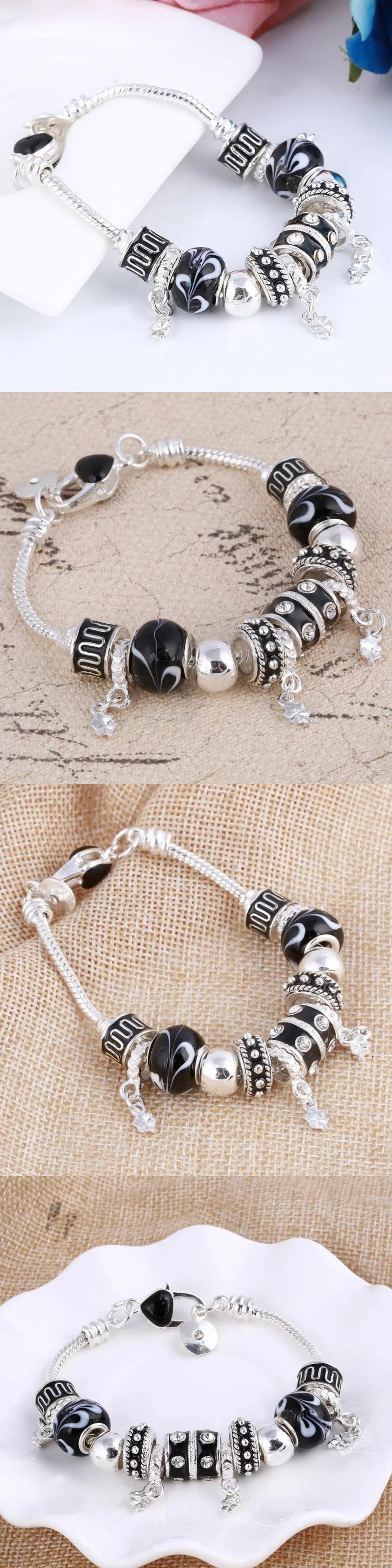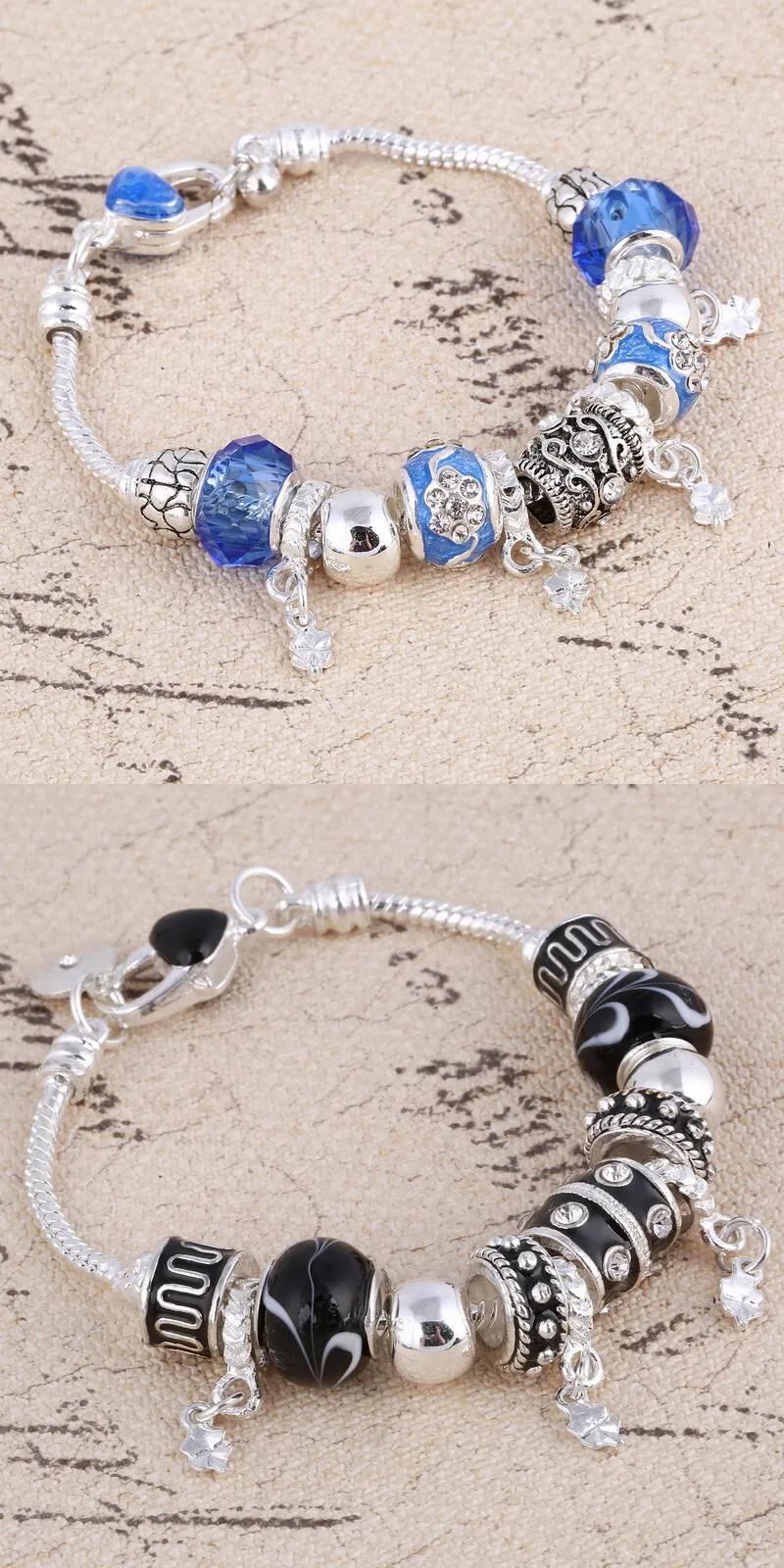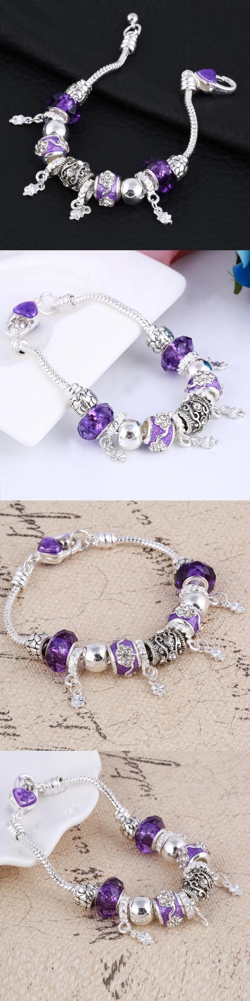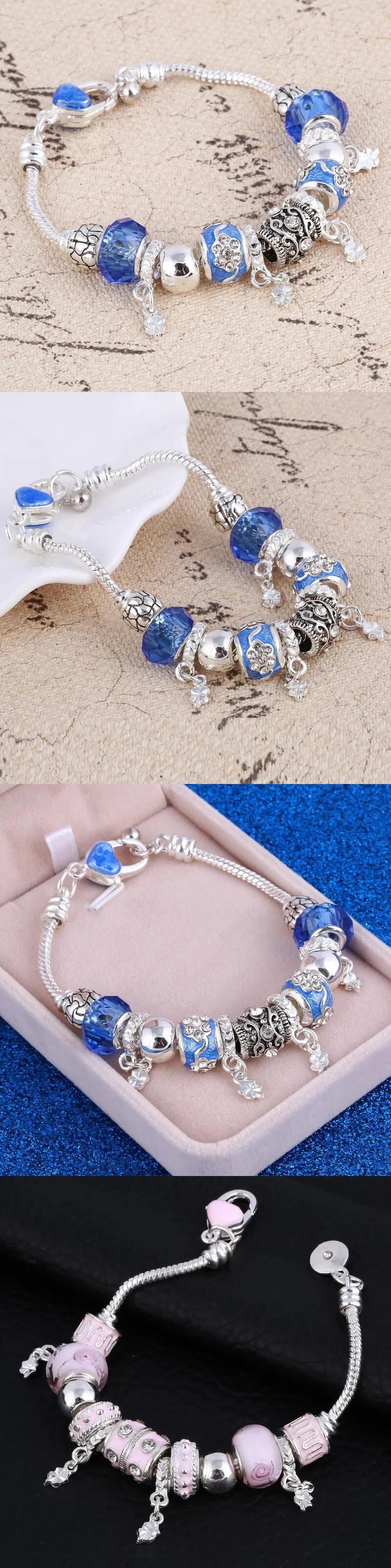 送料無料 ハートチャームビーズフィットシルバーカラーブレスレットクリスタルビーズブレスレット & バングル女性ジュエリー 銀 AE1556555567009446964