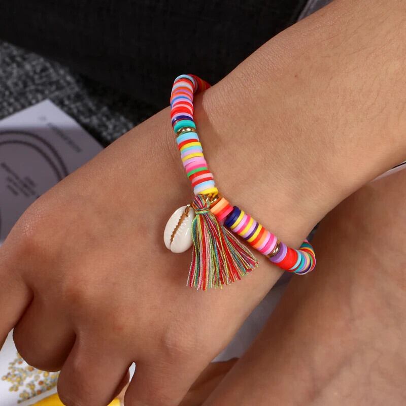 送料無料 シェル弾性ブレスレットボヘミアンカラフルなポリマークレイビーズブレスレット女性ホリデージュエリー貝殻ビーチブレスレット エラスティック 伸縮 AE1556555543936088079