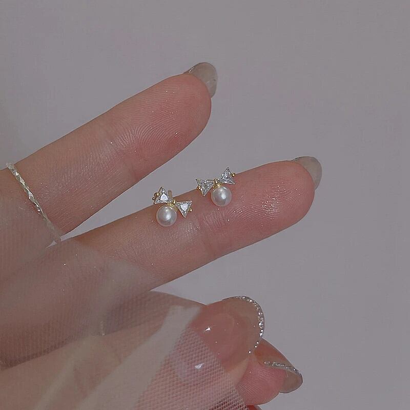 送料無料 トレンドシルバーカラーの弓ジルコンパールスタッドピアス女性クリエイティブ気質絶妙なガールズパーティージュエリーギフト リボン イヤリング 真珠 銀 AE12776767741157934904