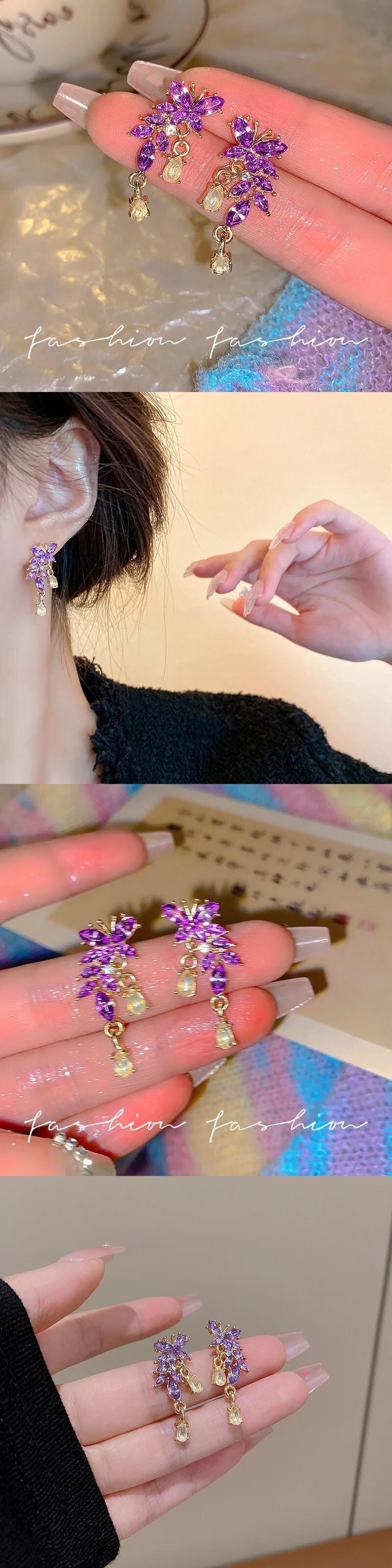 送料無料 フランスの高級絶妙なパープルカラークリスタルフラワースタッドピアス女性ジルコン蝶電話イヤリングパーティージュエリーギフト 指輪 フラワーデザイン AE12776767753878620439
