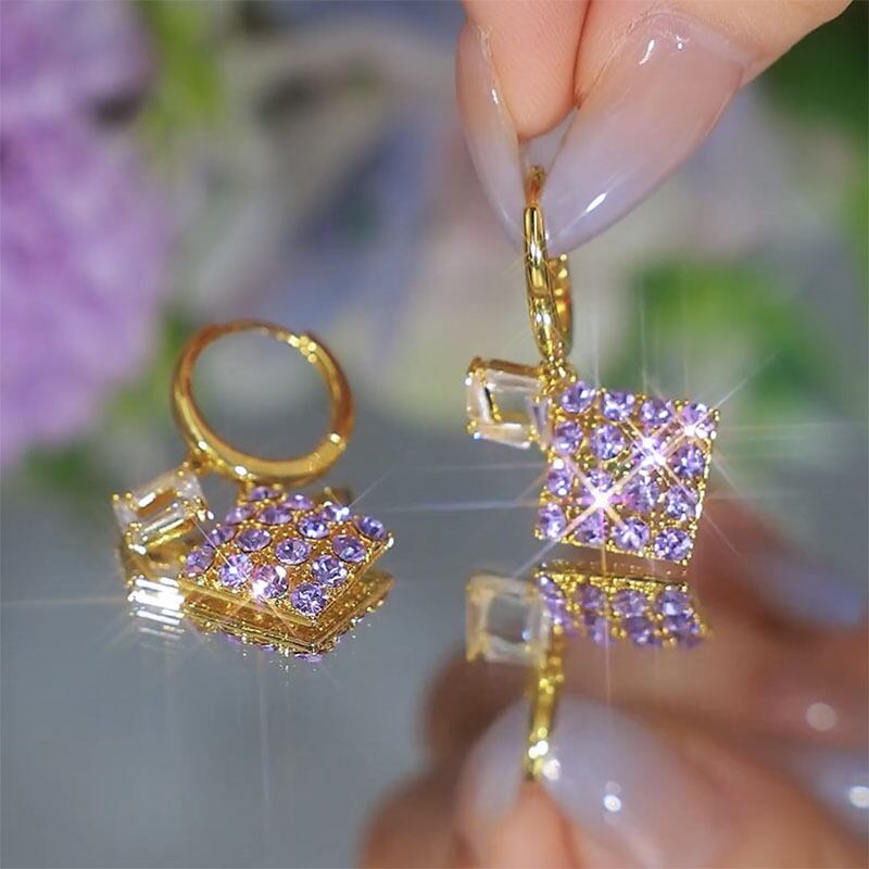 送料無料 2024 スタイル Esquisite 幾何学的なスクエアクリスタルフープイヤリング女性パープルカラーメタルウェディングジュエリーギフト 指輪 スクウェア AE12776767725240236923