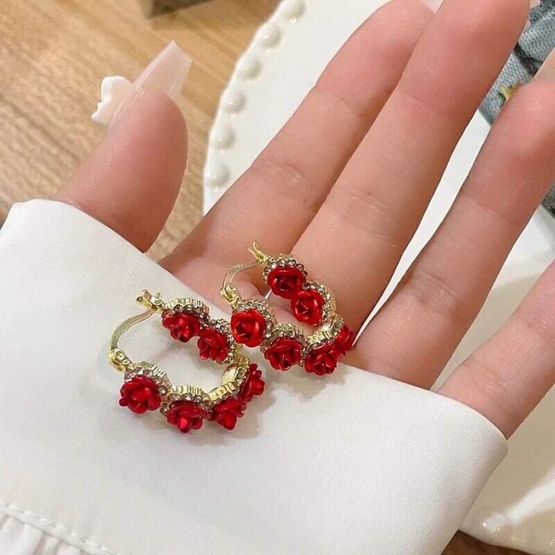 送料無料 2023 フレンチ絶妙なロマンチックなレッドローズイヤリング女性ゴールドカラー気質ウェディングパーティージュエリーギフト 指輪 AE12776767717784390444