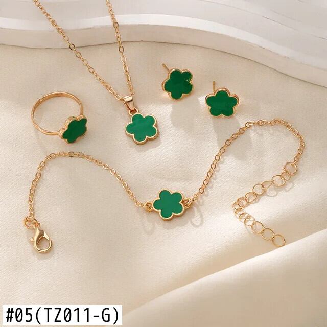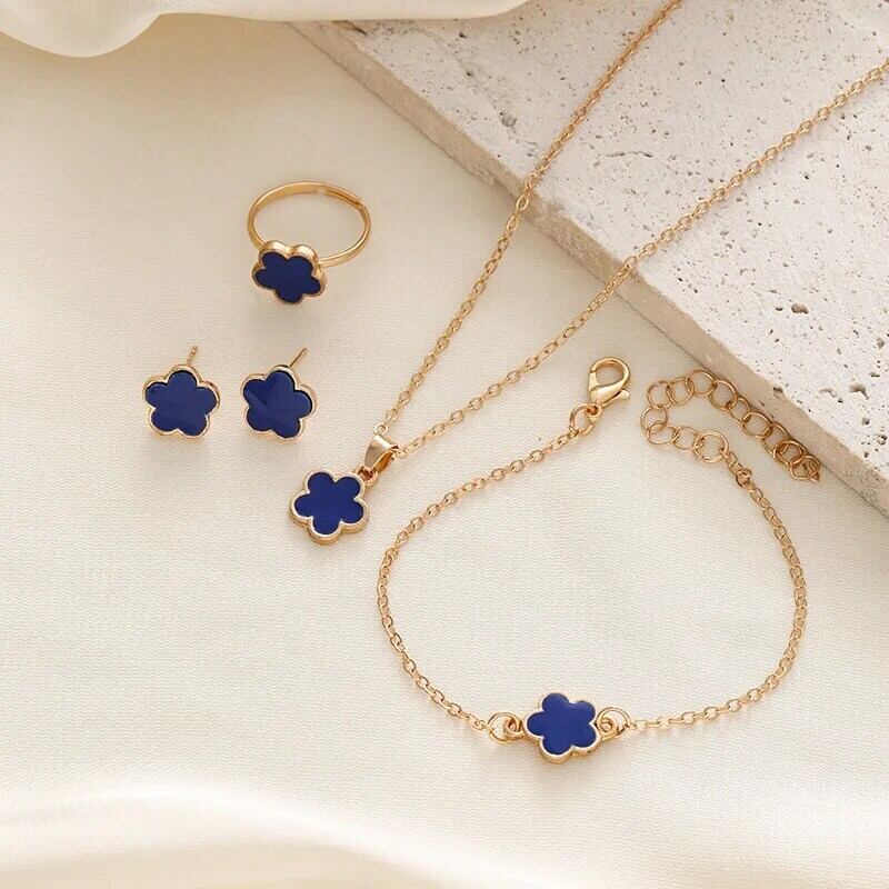 送料無料 4 個幸運の 5 枚の花びらの花 5 葉のクローバー リング ブレスレット イヤリング ネックレス 4 個セット女性スタイリッシュなアクセサリー レース 指輪 フラワーデザイン AE12776767710570004979