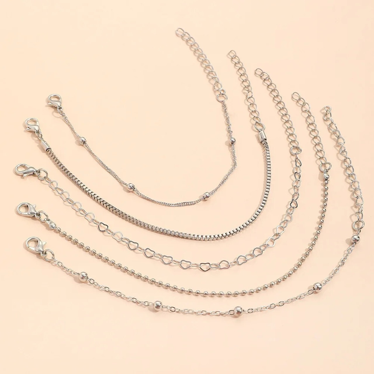 送料無料 5 ピース/セットトレンディな幾何学セットシンプルな積み重ね可能なシルバーカラーのメタルチェーンブレスレット女性ヴィンテージシックなハートチェーンブレスレットセット 銀 ビンテージ AE12776767725197610911