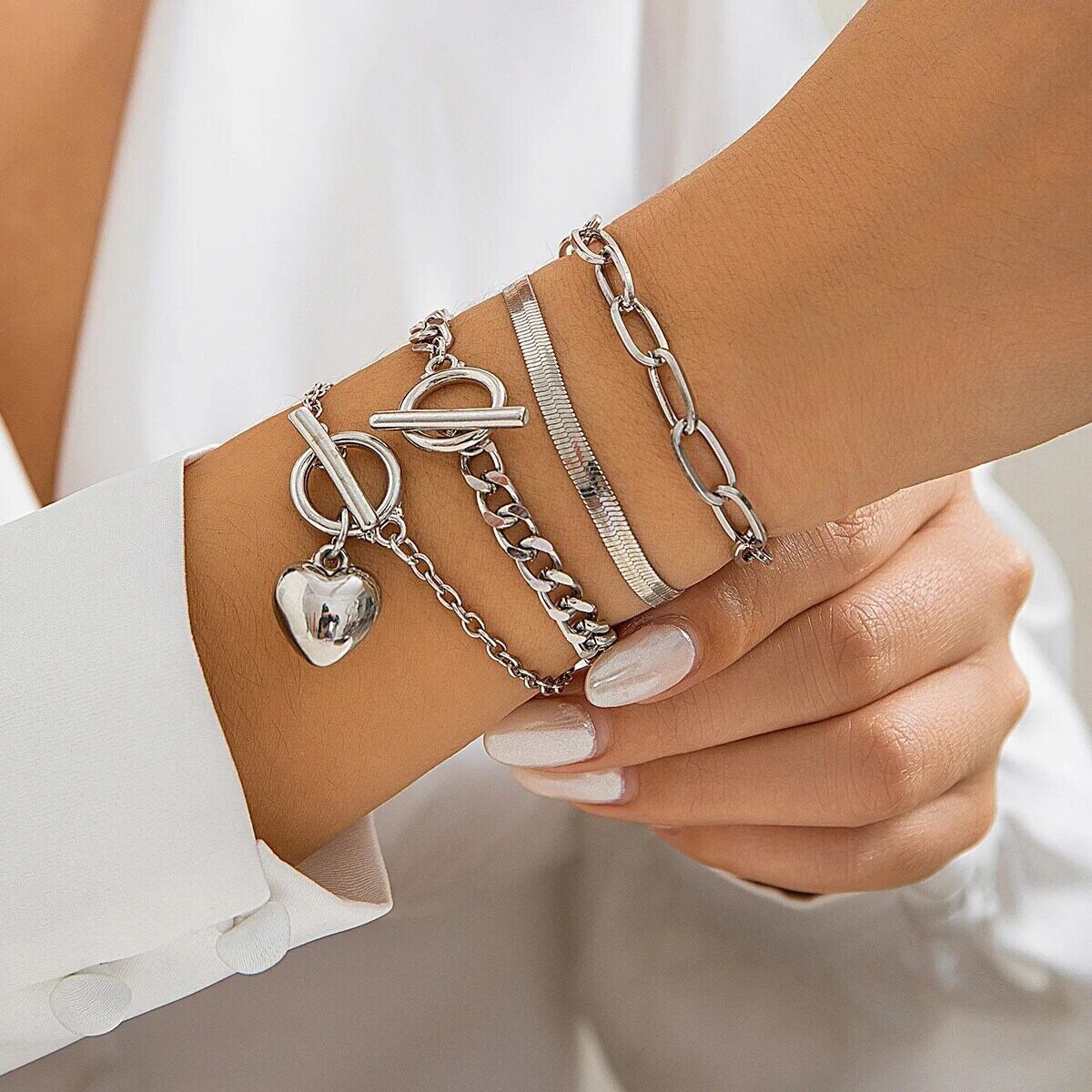 送料無料 幾何学的なラブハートパンク甘いクールキューバチェーンブレスレット女性メタリック風セットスネークボーンチェーンヒップホップブレスレット PartyJewelry 大人ガーリー スウィート キュート カジュアル AE12776767791803086302