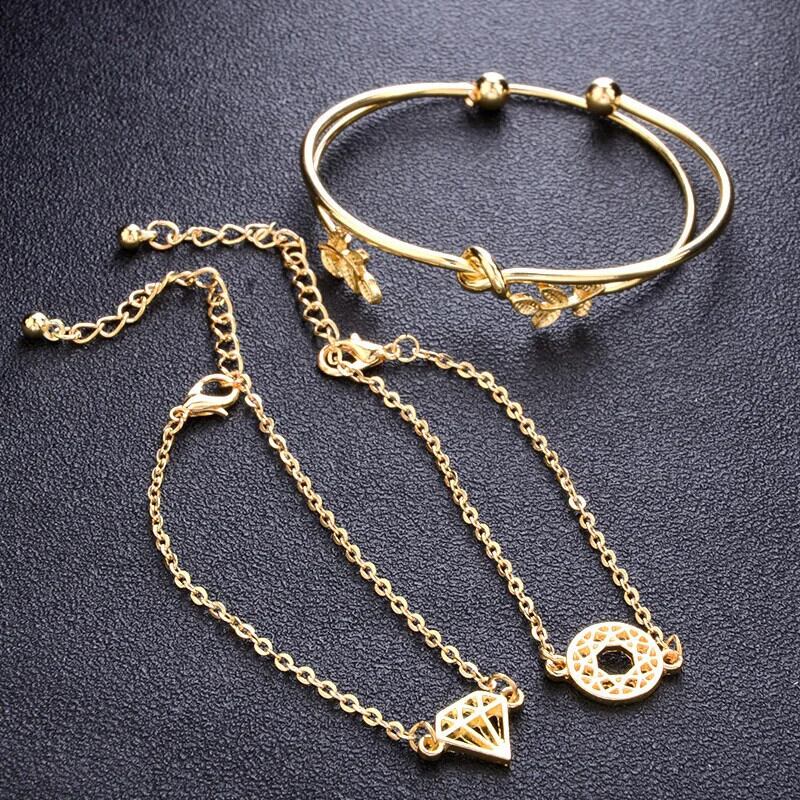 送料無料 4 個セットボヘミアンゴールドカラー幾何リンクチェーンブレスレットセット女性クリスタルリーフオープンカフバングルジュエリーアクセサリー AE12776767750447997372