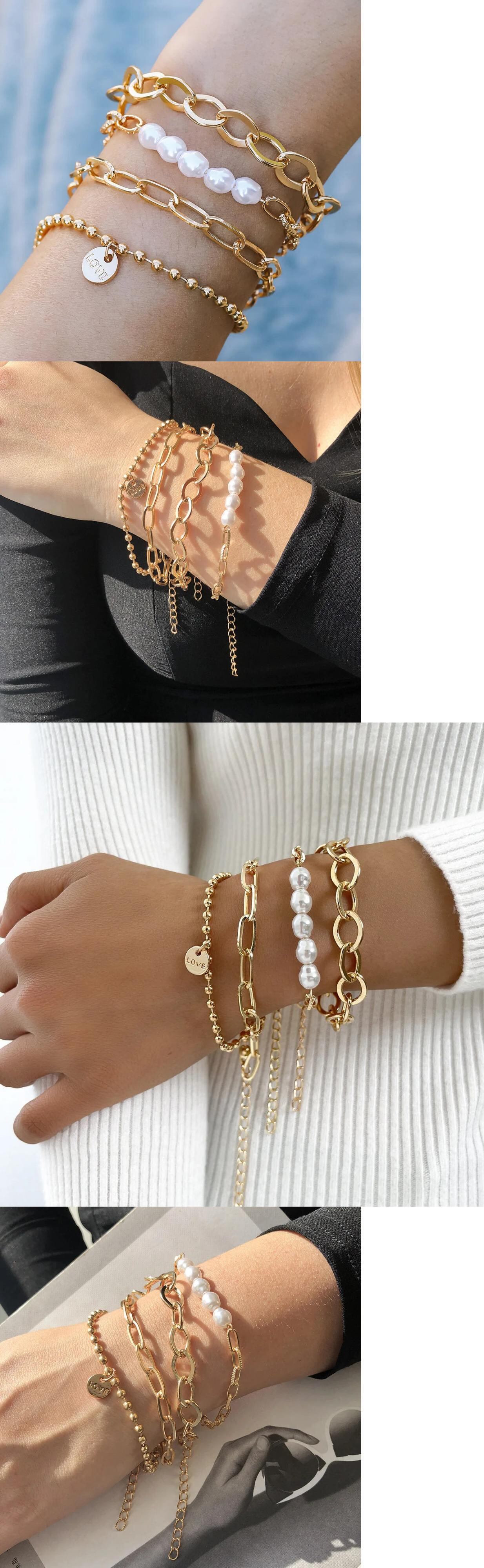 送料無料 パールゴールドカラー Roundel LOVE 大チェーン多層調節可能な女性ヴィンテージブレスレットセットパーティージュエリー アジャスタブル マルチレイヤー 真珠 ビンテージ AE12776767788205472661