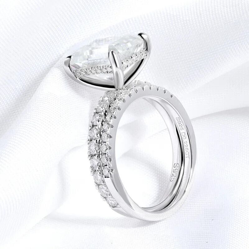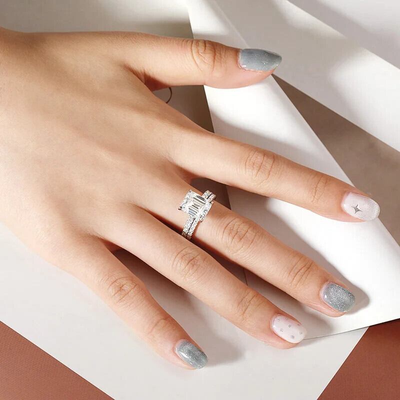 送料無料 Smyoue 4,8 CTTW Smaragdschliff Voll-Moissanit-Verlobungsring für Damen、セット、豪華な 925er スターリングシルバー、ホッホツァイト、レイバーディアマントバンド、GRA AE66776776580708726426