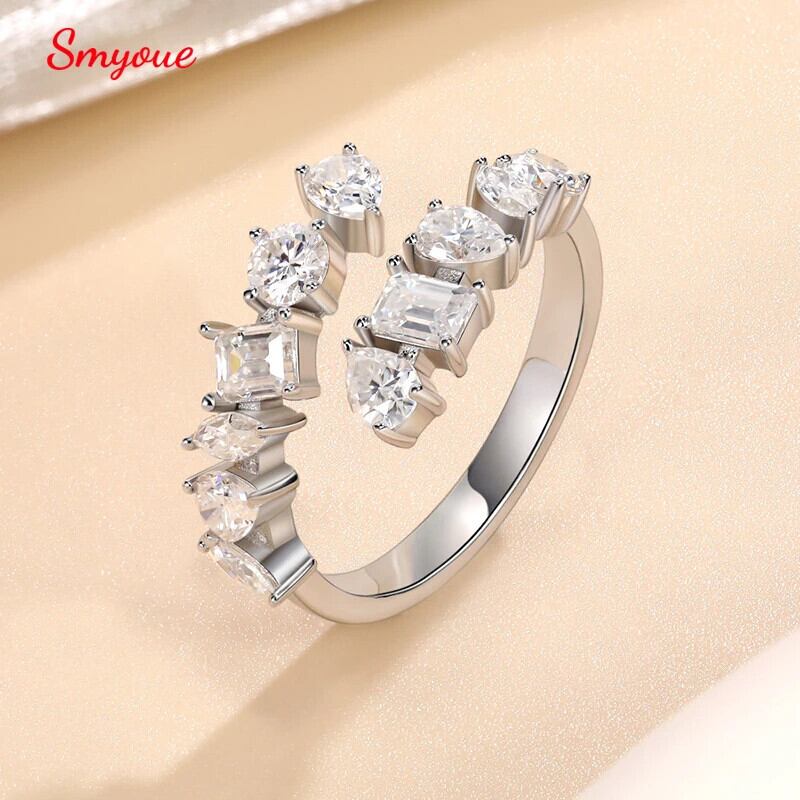 送料無料 Smyoue 100 % echter All-Moissanit-Ehering für Frauen、unregelmäßig、verstelbar、Luxus-Sterlingsilber 925、halbe Ewigkeit、Band GRA AE66776776568636275151